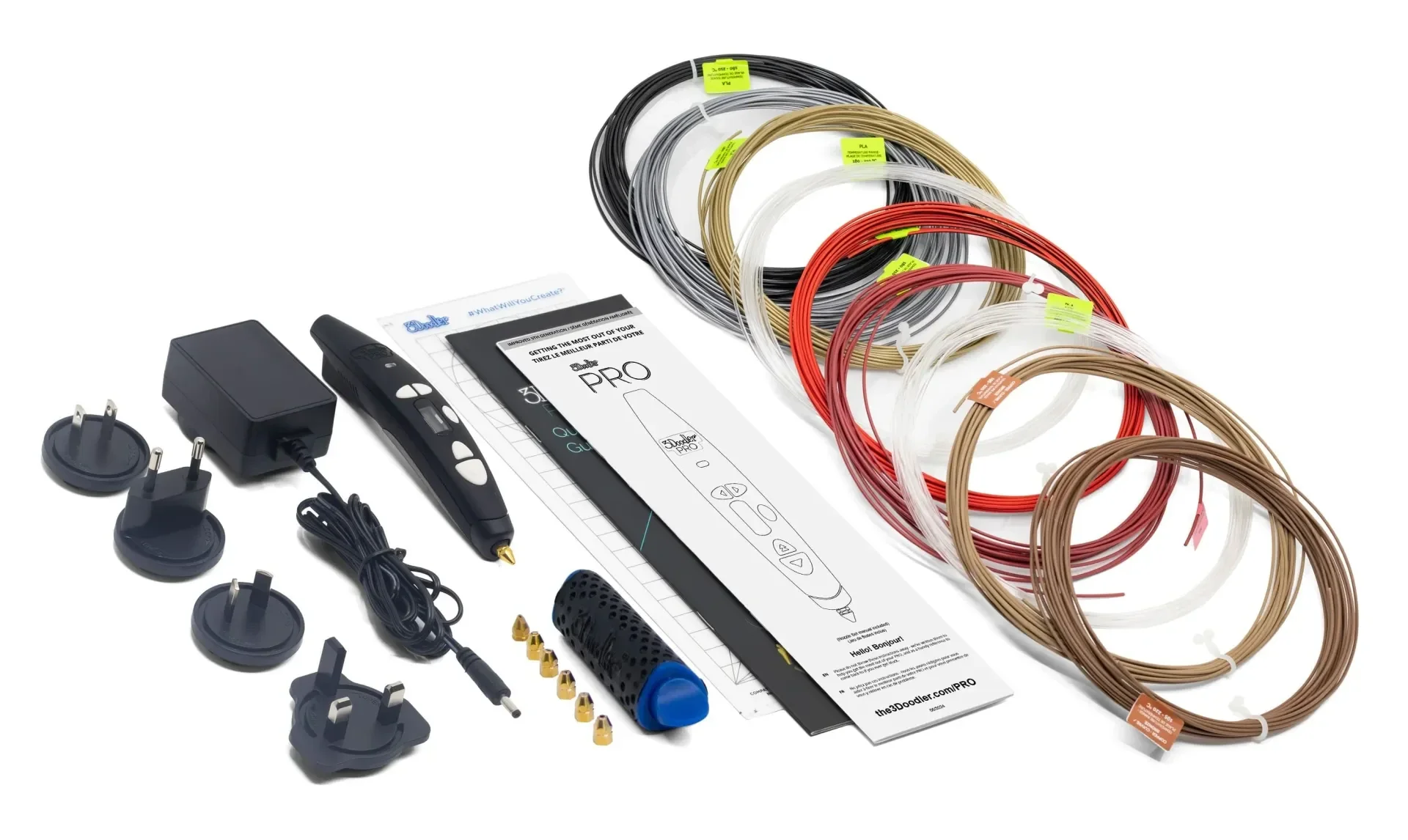 Der 3Doodler PRO III richtet sich an professionelle Anwender, die Entwürfe, Modelle oder Prototypen eigenhändig und kontrolliert aufbauen möchten. Seine Materialvielfalt und die präzise Steuerung unterstützen detailorientierte Arbeiten in Atelier, Studio oder unterwegs. Das enthaltene Zubehör – inklusive Düsenset und internationalem Adapter – erleichtert den Einsatz in unterschiedlichen Umgebungen und Arbeitsabläufen.