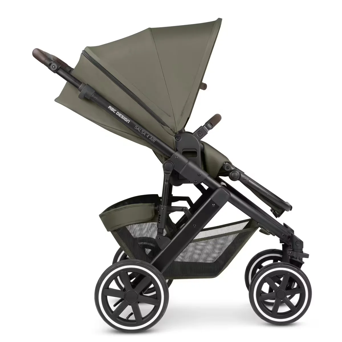 Das ABC DESIGN Kinderwagenset Salsa 4 Air Starter Set in der Farbvariante „Wheat“ (Olivgrün) vereint Kinderwagen, Babywanne, Babyschale „Tulip“ und vielfältiges Zubehör zu einem durchdachten Travelsystem. Mit luftbereiften, kugelgelagerten Rädern und integrierter Federung bietet das schwarze Aluminiumgestell ruhige Fahreigenschaften von Geburt an. Dank i-Size-Zulassung (ECE R 129) begleitet die Babyschale Kinder von 45 bis 85 cm; der Sportwagenaufsatz mit verlängerbarem Verdeck und umsetzbarem Sitz wächst später flexibel mit.
