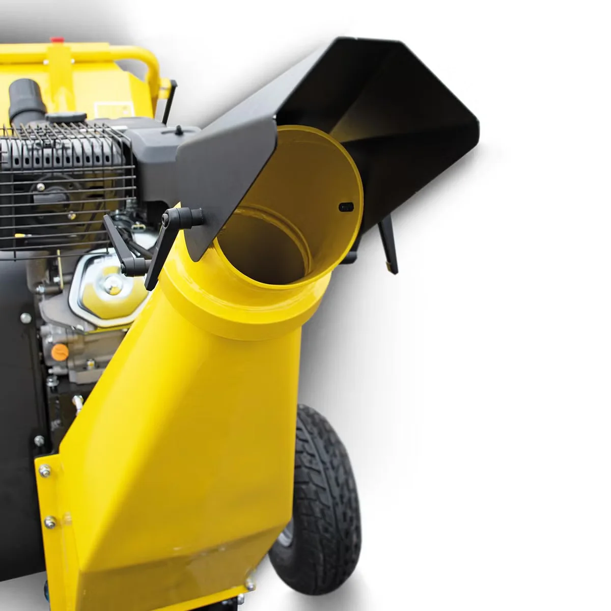 - Großer Einwurftrichter – erleichtert das Befüllen und beschleunigt das Arbeiten, besonders bei gemischtem Schnittgut.