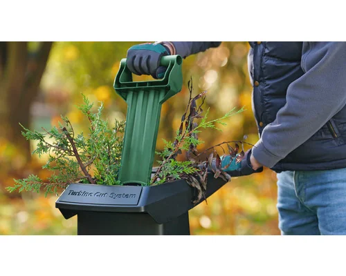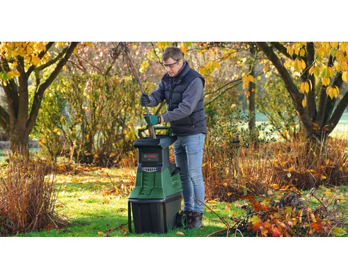 Der Turbinenhäcksler BOSCH AXT 25 TC ist für das zuverlässige Zerkleinern von Gartenabfällen konzipiert. Mit seiner Turbine-Cut-Technologie und einem bürstenlosen 2.500-Watt-Induktionsmotor verarbeitet der Häcksler Äste, hartes Dornengestrüpp sowie Laubabfälle effizient und leise. So entsteht aus sperrigem Material nahezu nährstoffreiches Schnittgut, das sich gut sammeln und weiterverwenden lässt.