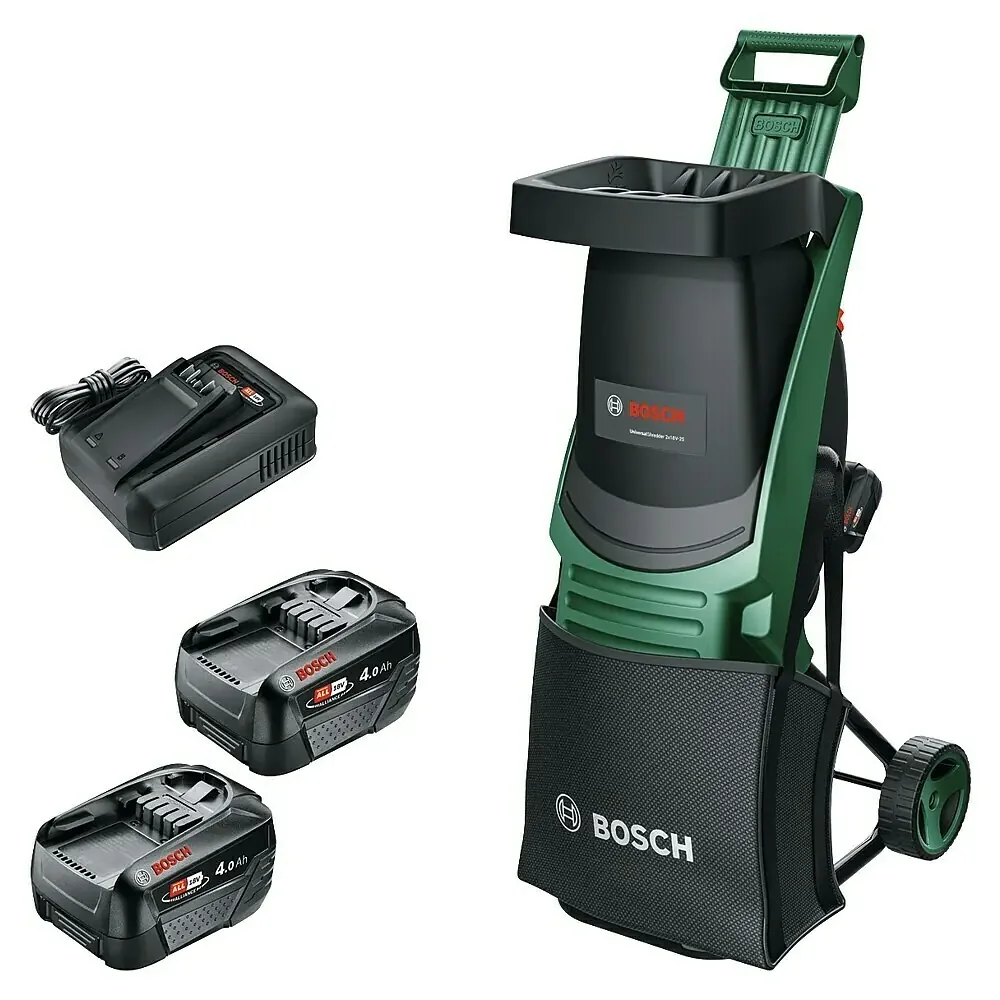 Der Bosch UniversalShredder 2x18V-25 ist ein akkubetriebener Gartenhäcksler für kraftvolles, unterbrechungsfreies Zerkleinern von Schnittgut. Zwei 18-V-Akkus liefern zusammen 36 V Leistung. Ein bürstenloser Motor und die automatische OptiCut-Drehzahlsteuerung sorgen für effizientes Arbeiten – kabellos, flexibel und komfortabel.