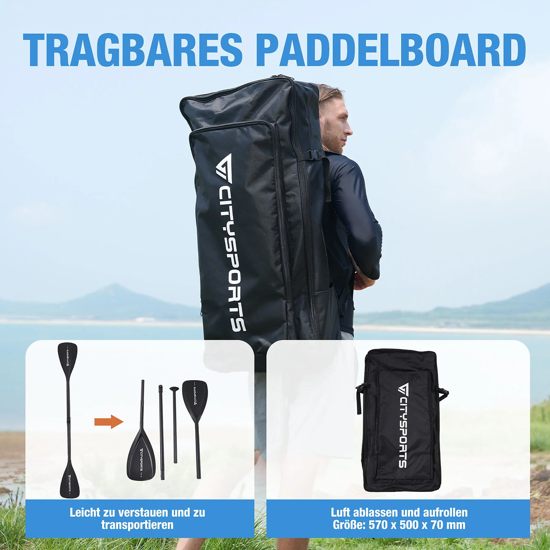 - Praktisch transportierbar – schnell entlüftet, kompakt aufgerollt; abnehmbare Finne erleichtert das Schleppen, mittiger Tragegriff für einfaches Anheben.
