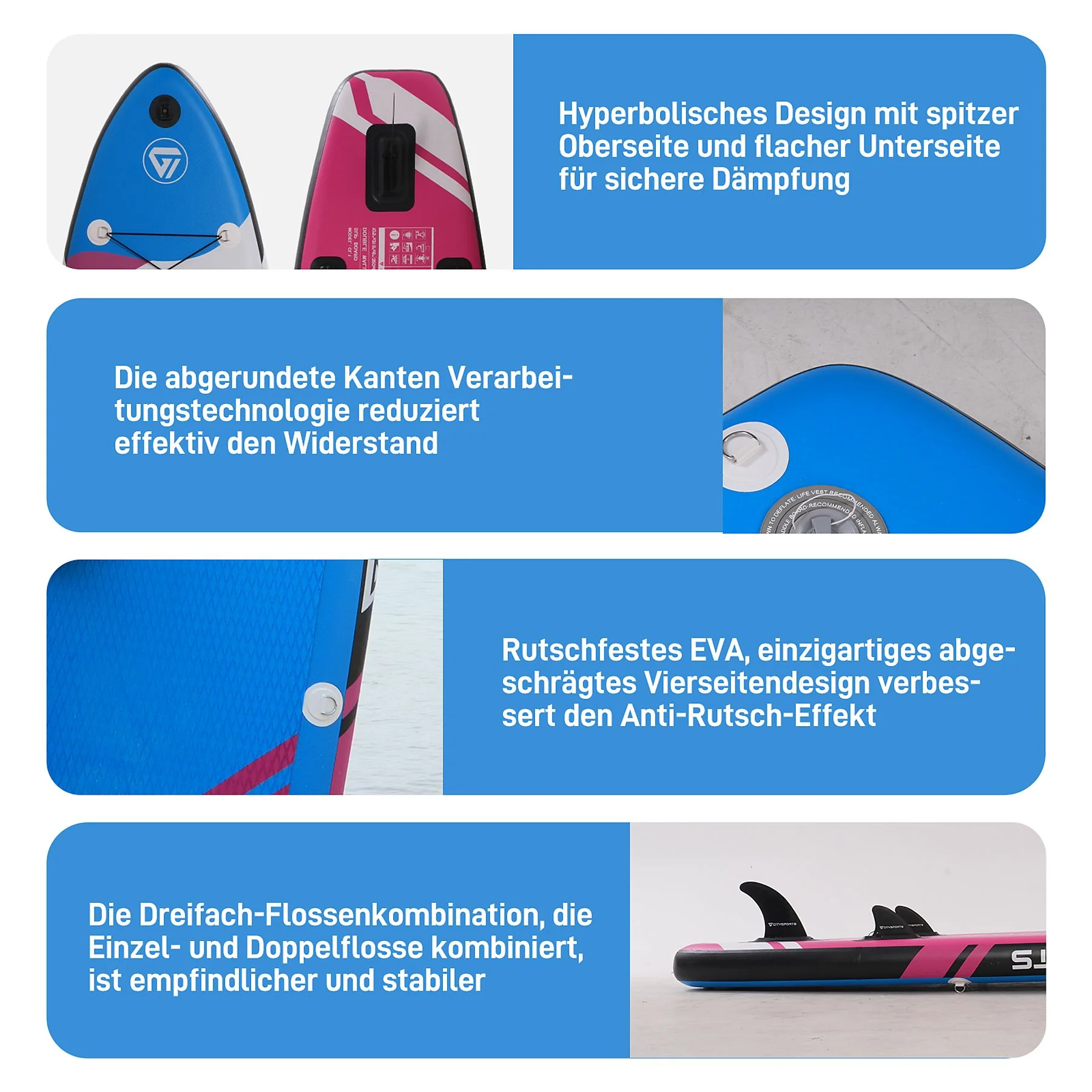 Geeignet für Nutzerinnen und Nutzer, die ein aufblasbares SUP mit stabilem Gleitverhalten suchen – vom ersten Paddelversuch bis zur entspannten Tour. Der Lieferumfang umfasst ein Paddleboard, ein verstellbares Paddel, drei abnehmbare Flossen, eine wasserdichte Tasche, ein Sicherheitsband für den Knöchel, eine Luftpumpe, einen Rucksack, ein Reparaturset und einen Sitz. Dank optionalem Kajak-Sitz und D-Ringen lässt sich der Einsatzbereich schnell erweitern.