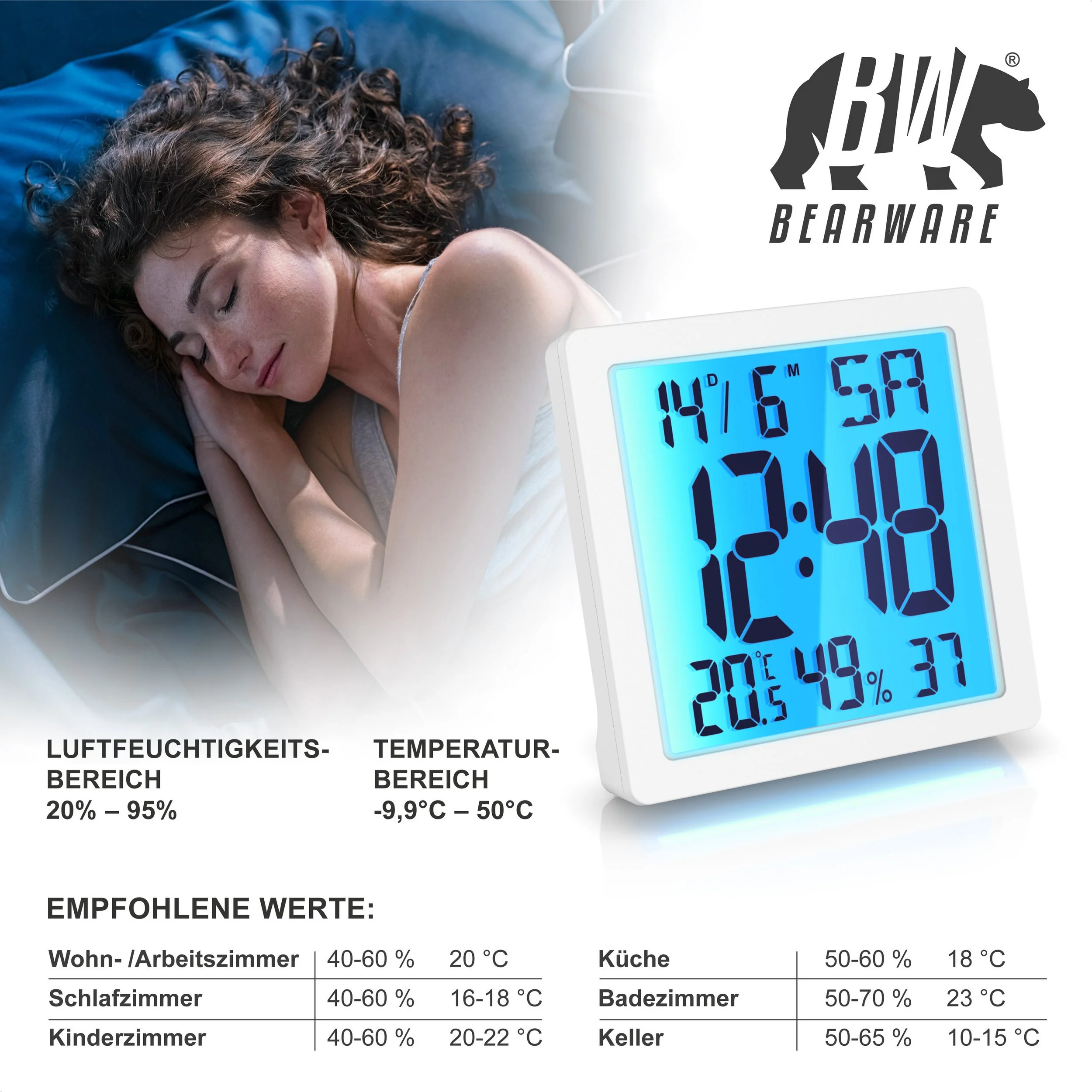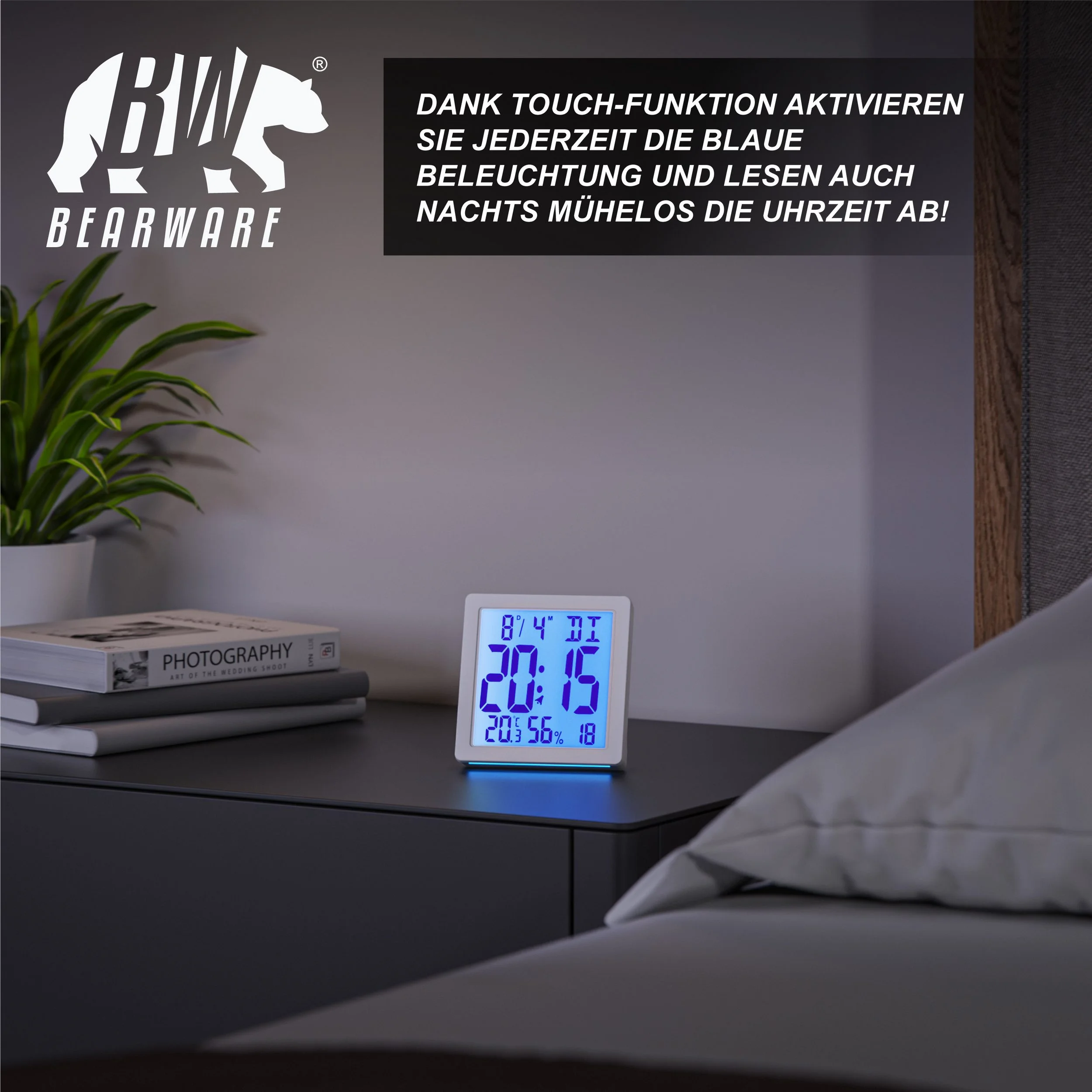Highlights: Intuitive Bedienung, großes Display, blaue Touch-Beleuchtung, duale Alarmfunktion, Temperatur- & Feuchtemessung, leicht & reisetauglich.