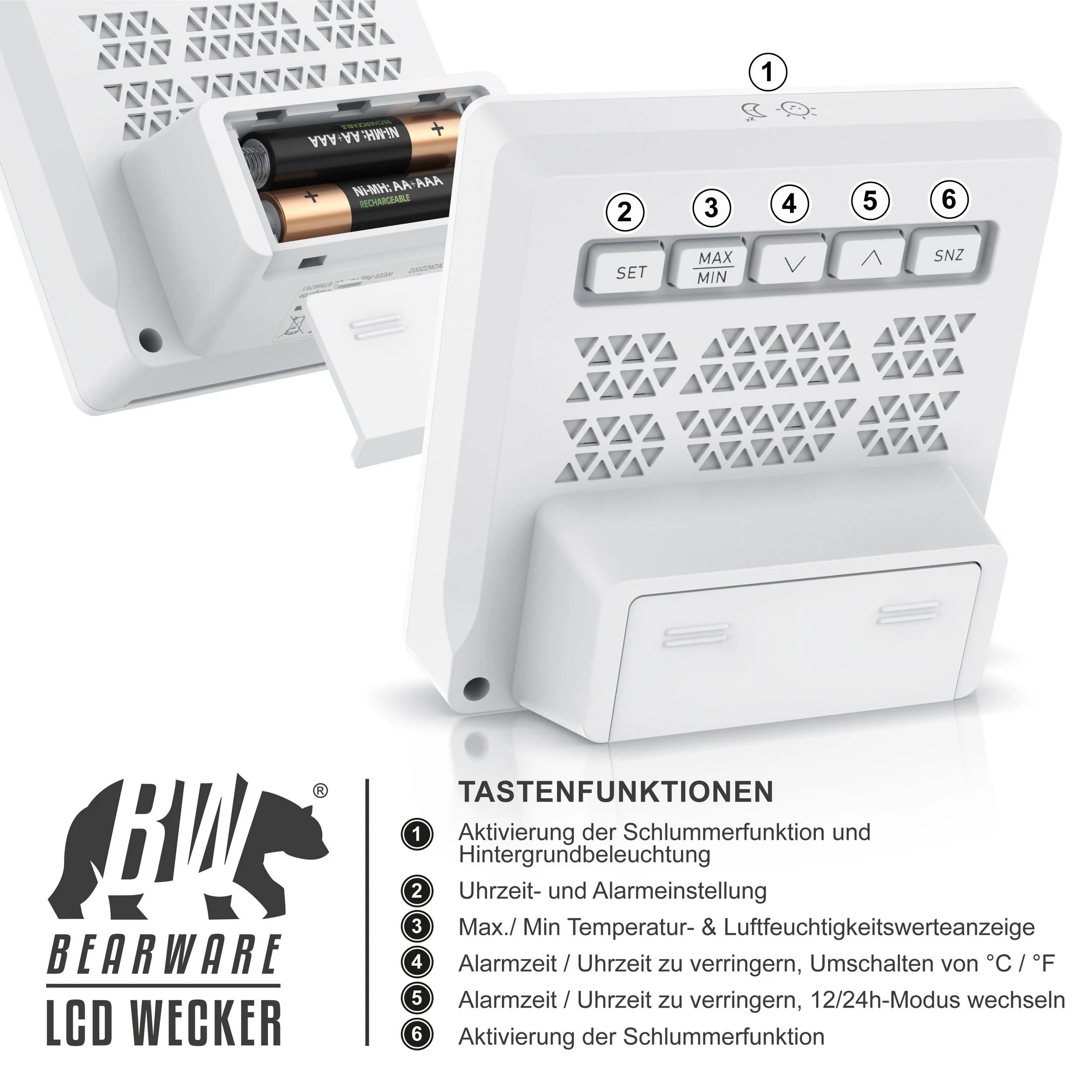 2 Alarmzeiten • Hintergrundbeleuchtung • Snooze • Temperatur- & Feuchtemessung • Kompakt für Zuhause & unterwegs
