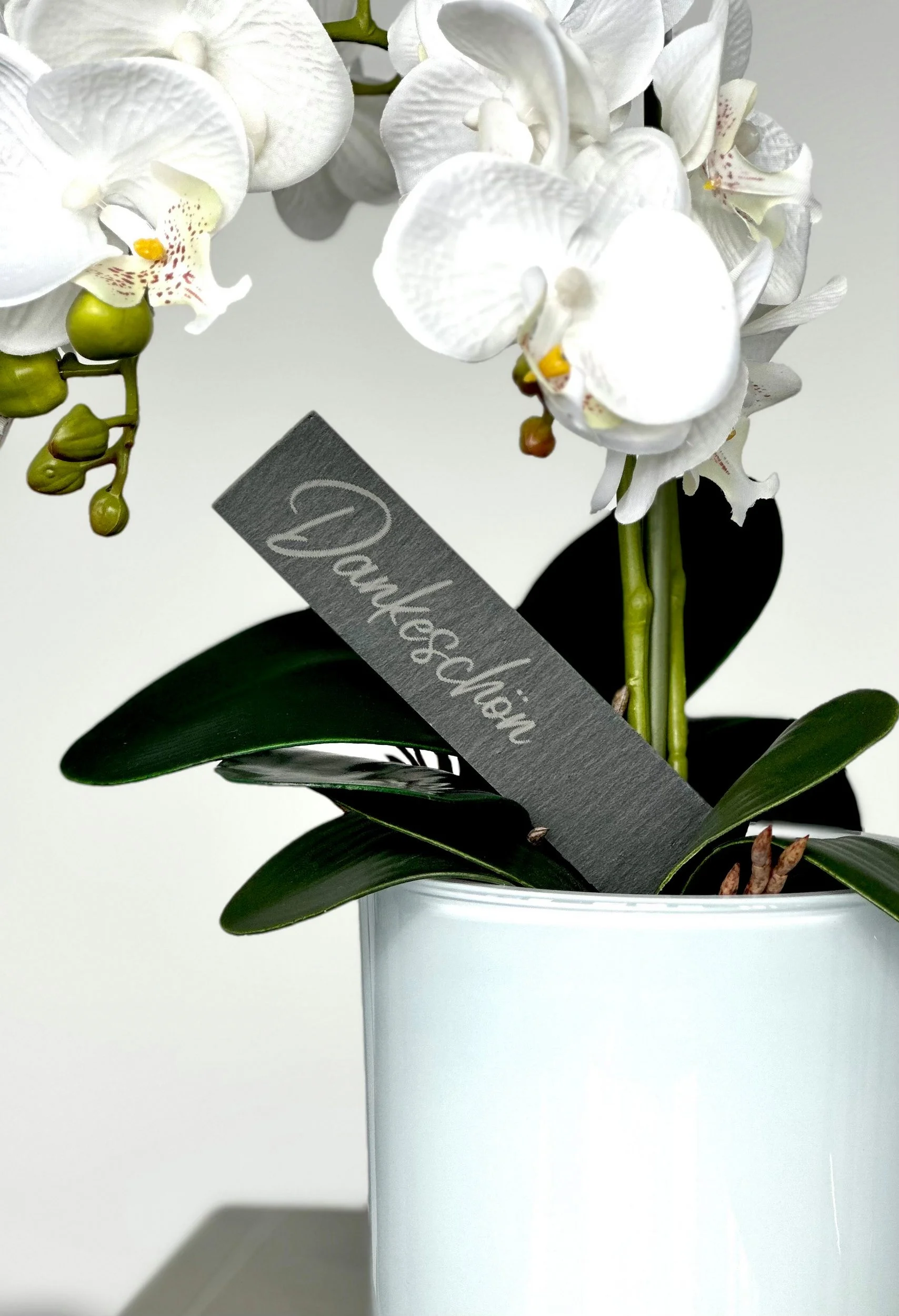 Der gravierte Schieferstecker „Dankeschön“ ist eine stilvolle Möglichkeit, Wertschätzung auszudrücken. Der natürliche Charakter des Schiefers macht jedes Stück zu einem Unikat und verleiht Blumentöpfen, Gestecken oder dekorierten Arrangements eine persönliche Note.